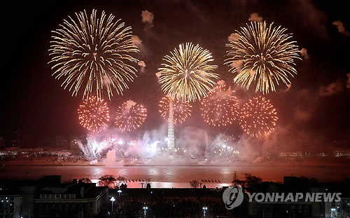(서울=연합뉴스) 이상현 기자 = 북한은 16일 김정일 국방위원장의 생일인 '광명성절'을 맞아 성대한 불꽃놀이를 벌이며 김정은 국방위원회 제1위원장을 향한 충성을 다짐했다.