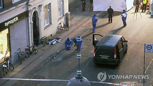 △ 코펜하겐 경찰, 총격테러 용의자 사살 (AP/TV2노르웨이=연합뉴스) 덴마크 코페하겐에서 총격테러를 벌이던 용의자가 15일(현지시간) 경찰에 사살돼 노레브로역 인근 도로에 쓰러져 있는 가운데 수사관들이 현장을 조사하고 있다. 경찰은 코펜하겐 시내에서 14일과 15일에 걸쳐 3차례 발생한 총격사건은 동일범에 의한 것으로 판단된다고 말했다. 이번 3차례 총격으로 용의자를 포함해 모두 3명이 숨지고 5명이 부상했다.
