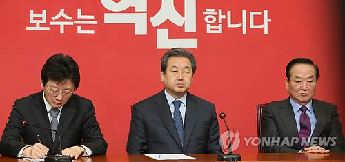 | △ 굳은 표정만 남고 (서울=연합뉴스) 진성철 기자 = 이완구 국무총리 후보자 인준 표결을 앞둔 16일 국회 새누리당 최고위원회에서 유승민 원내대표(왼쪽 부터), 김무성 대표, 서청원 최고위원이 굳은 표정을 짓고 있다. |