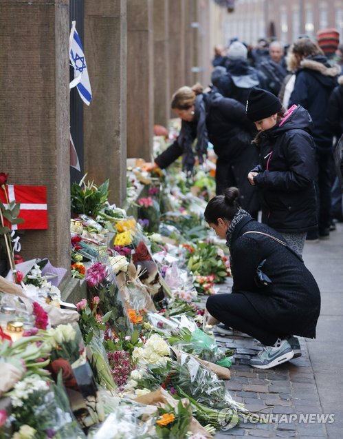 △ 코펜하겐의 애통 (AP=연합뉴스) 총격테러가 발생한 덴마크 코페하겐의 유대교 회당 앞에 15일(현지시간) 행사 출입관리 일을 하다 숨진 단 우산 씨의 죽음을 애도하는 발걸음이 끊이지 않고 있다. marshal@yna.co.kr Flowers lay in front of the synagogue where one person was killed in Copenhagen, Denmark, Sunday, Feb.15, 2015. The alleged shooter was later killed by police who believe he also shot another person at a cultural center. (AP Photo/Michael Probst).