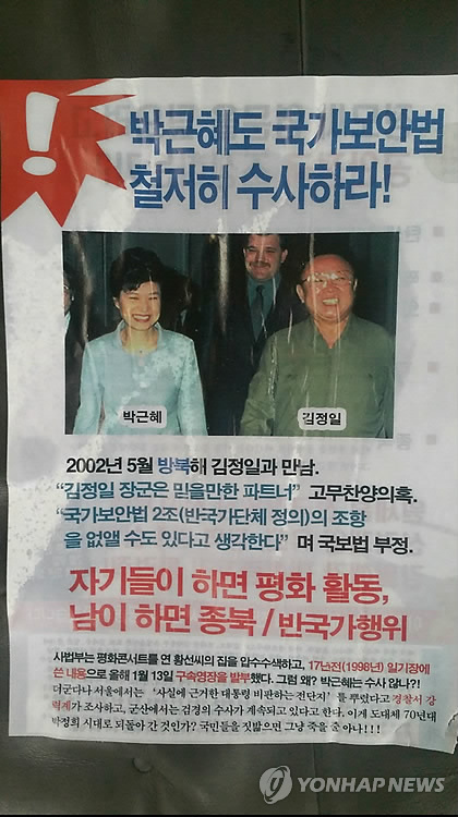 현장에서 발견된 유인물은 박 대통령이 김정일 전 북한 국방위원장과 나란히 서서 찍은 사진과 함께 '박근혜도 국가보안법 철저히 수사하라!', '자기들이 하면 평화활동, 남이하면 종북/반국가행위' 등의 내용이 적혀 있었다.