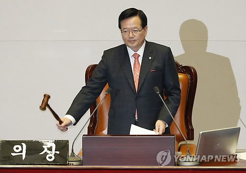 △ 이완구 국무총리 후보자 임명동의안 가결 (서울=연합뉴스) 이상학 기자 = 정의화 국회의장이 16일 국회에서 열린 제331회 국회 (임시회) 제4차 본회의에서 이완구 국무총리 후보자 임명동의안 가결을 발표한 뒤 의사봉을 두드리고 있다.