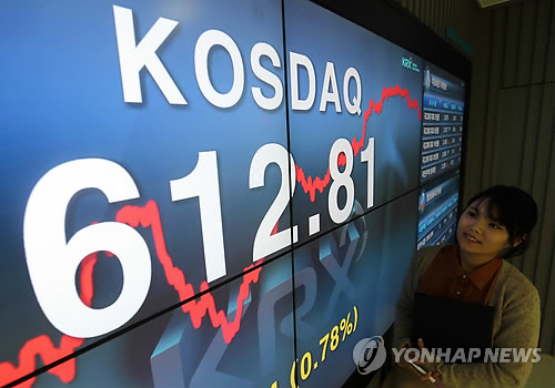 △ 코스닥, 6년8개월만에 610선 등정 (서울=연합뉴스) 16일 서울 여의도 한국거래소에서 관계자가 코스닥 전광판 앞을 지나고 있다. 이날 코스닥은 6년 8개월 만에 610선을 돌파했다. 코스닥지수가 610선을 넘은 것은 2008년 6월 19일(610.99) 이후 처음이다.
