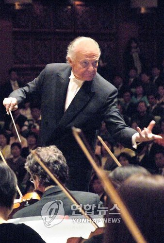 | △ 미국 뉴욕 필하모닉 교향악단 사상 첫 평양 공연을 이끈 '지휘 거장' 로린 마젤의 유족이 탈북자 자선사업을 시작하며 대북전단은 지원할 수 없다는 뜻을 밝혔다. 사진은 뉴욕 필하모닉 오케스트라 평양 동평양대극장 공연에서 지휘하는 로린 마젤.(연합뉴스 자료사진) |
