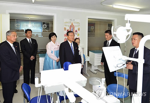 △ 허종만 조선총련 의장(가운데)이 작년 9월 평양 류경구강병원을 둘러보는 모습. (연합뉴스 자료사진)