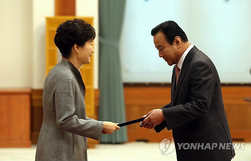 | △ 임명장 받는 이완구 총리 (서울=연합뉴스) 도광환 기자 = 이완구 신임 국무총리가 17일 오전 청와대에서 박근혜 대통령으로부터 임명장을 받고 있다. |
