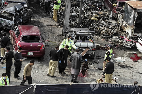 | △ 17일 파키스탄 라호르에서 경찰이 폭탄테러 현장을 조사하고 있다.(EPA=연합뉴스) |