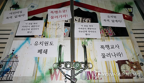 △ 인천시 부평구 모 어린이집에 아동학대 항의 문구가 붙어 있다.(연합뉴스 자료사진)