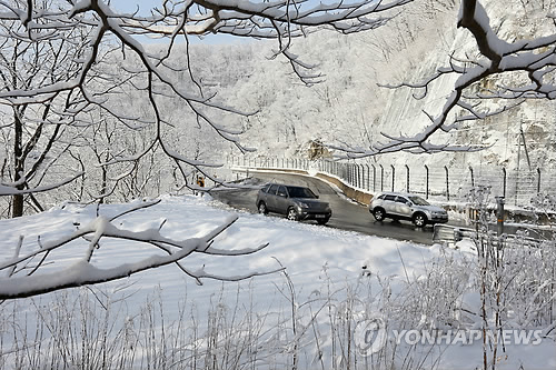 | △ '까치 설날' 강원 산간에 대설 (강릉=연합뉴스) 유형재 기자 = 17일 향로봉에 19cm의 눈이 쌓이는 등 강원 산간지역에 많은 눈이 내린 가운데 옛 영동고속도로 대관령 구간에서 차들이 조심스럽게 운전하고 있다. 16일부터 이날 오전 7시 현재까지 향로봉 19cm, 대관령 10cm, 태백 6.5cm, 양구 해안 6cm, 홍천 내면 4cm 등의 눈이 내렸다. 2015.2.17 yoo21@yna.co.kr |
