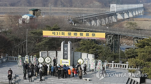 △ 망배단에 모인 실향민 (파주=연합뉴스) 임병식 기자 = 설날인 19일 오전 경기도 파주시 임진각 망배단에서 열린 합동망향제에서 실향민 가족이 절하고 있다.