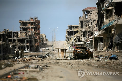 △ 리비아를 철권통치하던 카다피 정권이 무너진 뒤 이어진 내전으로 폐허로 변한 시르테 전경. 이 사진은 2011년 10월22일 촬영됐다. (AP=연합뉴스 자료사진)