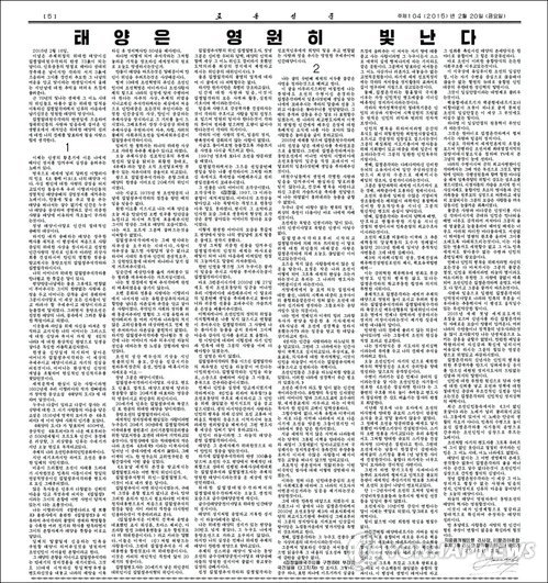 △ 이탈리아 친북 기업가, 김정은 찬양글 기고 (서울=연합뉴스) 이탈리아 한 친북 기업가가 김정일 국방위원장 생일(2월16일)을 맞아 북한 매체에 김정은 국방위원회 제1위원장을 찬양하는 글을 기고했다. 노동당 기관지 노동신문은 20일 5면 상단에 장카를로 엘리아 발로리 이탈리아종합투자그룹 이사장 명의의 '태양은 영원히 빛난다'라는 글을 게재했다. 사진은 노동신문에 게재된 발로리 이사장의 글. 2015.2.20 nkphoto@yna.co.kr