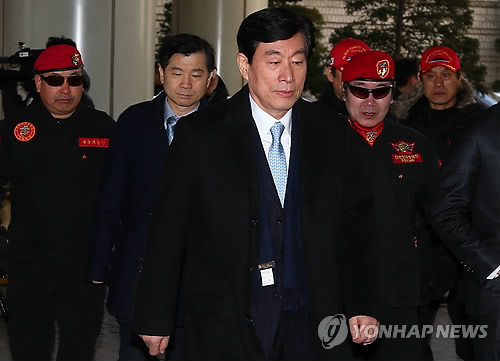 | △ epa04611395 Won Sei-hoon (C), former head of the South Korean National Intelligence Service, arrives in an appellate court.to be sentenced at the high court in Seoul, South Korea, 09 February 2015. The court sentenced him to three years in jail for intervening in the 2012 presidential election. EPA/KIM CHUL-SOO |