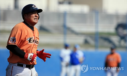 | △ 김태균, 아파도 1루까지 (오키나와=연합뉴스) 홍해인 기자 = 21일 오후 일본 오키나와 아카마 구장에서 열린 한화와 삼성의 연습경기. 8회초 한화 김태균이 공을 몸에 맞은 뒤 1루로 향하고 있다. 2015.2.21 hihong@yna.co.kr |