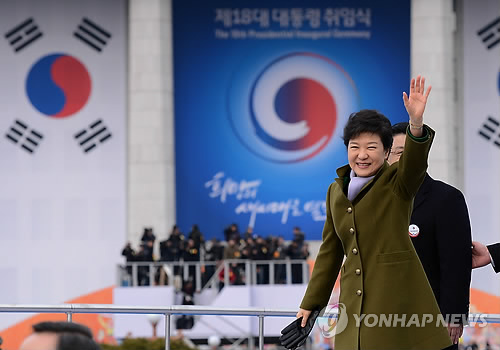 △ 박근혜 대통령이 2013년 2월 25일 국회에서 열린 제18대 대통령 취임식에서 시민들에게 손을 흔들고 있다.