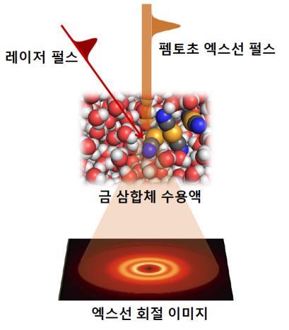 | △ 펨토초 엑스선 회절법 실험 과정. 레이저 펄스에 의해 수용액상의 금 삼합체의 광반응이 시작되고 특정 시간이 지난 뒤에 펨토초 엑스선 펄스로부터 회절 이미지를 얻는다. |