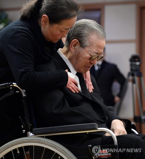 김 전 총리는 이날 오전 10시40분께 빈소에 도착해 하염없이 눈물을 흘렸고 영정사진을 쳐다보며 또다시 눈시울을 붉혔다. 휠체어를 탄 김 전 총리는 빈소 옆 작은방에 계속 머물며 문상객을 일일이 맞았다.