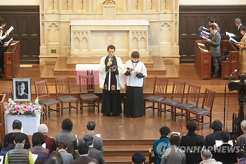 △ 도쿄 릿쿄대에서 윤동주 70주기 추도 예배 (도쿄=연합뉴스) 조준형 특파원 = 22일 오후 시인 윤동주(1917∼1945)가 생전 8개월 가량 다녔던 도쿄 릿쿄(立敎)대의 예배당에서 윤 시인 70주기 추도 예배가 열렸다. 2015.2.22 jhcho@yna.co.kr