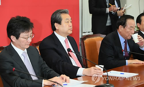 | △ 새누리당 최고위원회의 (서울=연합뉴스) 진성철 기자 = 새누리당 유승민 원내대표(왼쪽 부터), 김무성 대표, 서청원 최고위원이 23일 국회에서 열린 최고위원회의에서 이정현 최고위원의 발언을 듣고 있다. |