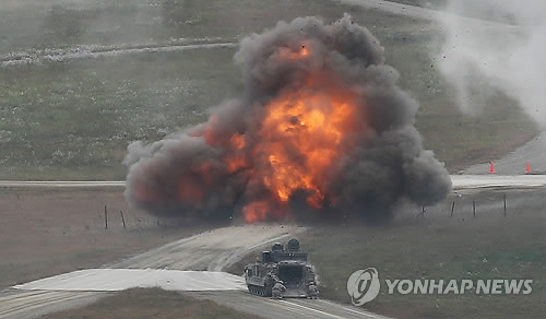 | △ 지난해 10월 1일 경기도 포천시 로드리게스 훈련장에서 열린 한미연합 실사격 훈련에서 미2사단 공병들이 장애물을 폭파하고 있는 모습. <<연합뉴스DB>> |