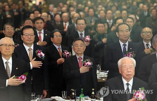| △ 광복회, 창립 50주년 기념식 (서울=연합뉴스) 최재구 기자 = 정의화 국회의장, 박유철 광복회장, 박승춘 국가보훈처장 등이 23일 서울 여의도 63컨벤션에서 열린 광복회 창립 50주년 기념식에서 국기에 경례하고 있다. 2015.2.23 jjaeck9@yna.co.kr |
