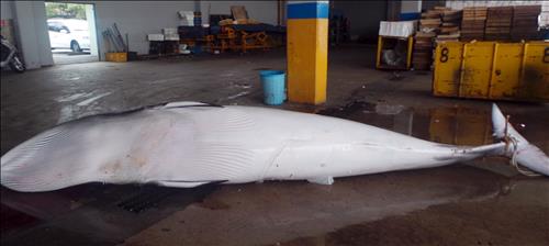 23일 울산해양경비안전서에 따르면 이날 오전 6시께 울산시 동구 주전항 동쪽 19㎞ 해상에서 7.3t급 통발어선의 어구 줄에 밍크고래 1마리가 꼬리가 걸린 채 죽어 있는 것을 선장 도모(58)씨가 발견해 신고했다.
