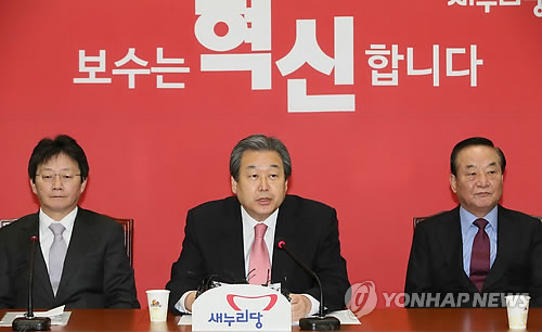 | △ 김무성 "입각의원, 개혁 성공 못하면 돌아올 생각마라" (서울=연합뉴스) 진성철 기자 = 새누리당 김무성 대표가 23일 국회에서 열린 최고위원회의에서 이완구 총리 임명 및 4개 부처 개각으로 인해 국무위원 중 현역 의원 출신이 6명으로 늘어나게 된 데 대해 "개혁을 성공하지 못하면 (당으로) 돌아올 생각을 하지 마라"고 말하고 있다. 왼쪽부터 유승민 원내대표, 김 대표, 서청원 최고위원. |