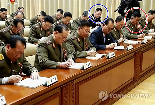 | △ 북한 노동당 중앙군사위 회의 등장한 장정남·김명식 (서울=연합뉴스) 조선중앙TV는 23일 노동당 중앙군사위원회 확대회의 소식을 전하며 장정남(빨간색 동그라미) 전 인민무력부장이 회의장 맨 앞줄에 앉아있는 사진을 방송했다. 장정남은 2013년 5월 50대 초반의 나이에 김격식의 뒤를 이어 인민무력부장에 오르는 등 승승장구했지만 1년여 만에 자리에서 물러났고 작년 9월 이후 공개석상에서 자취를 감췄다. 그가 황병서 총정치국장, 리영길 총참모장과 같은 군부 핵심 인물들과 같은 줄에 앉은 점으로 미뤄 높은 위상을 갖고 있는 것 아니냐는 분석도 나온다. 일각에서 경질설이 제기됐던 김명식 해군사령관(파란색 동그라미)도 둘째 줄에 모습을 드러내 건재함이 확인됐다. 2015.2.23 nkphoto@yna.co.kr |