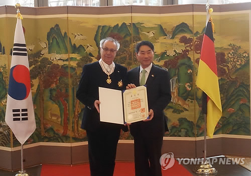 | △ 한국 문화훈장 받은 베를린영화제 집행위원장 (베를린=연합뉴스) 고형규 특파원 = 디터 코슬리크 베를린영화제 집행위원장이 23일(현지시간) 베를린 시내 한국대사관에서 한국 정부를 대신해 김재신 주독 한국대사가 수여한 은관 문화훈장을 받은 뒤 기념촬영을 하고 있다. 지난 2001년부터 현직을 지켜온 코슬리크 위원장은 한국에도 다섯 차례 방문하고 김기덕 감독의 작품을 선호하는 등 우리나라와 인연이 깊은 독일 내 몇 안 되는 고위급 문화계 인사로 분류된다. |
