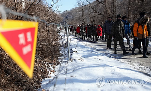 △ 육군 3사단이 예비역 전우와 현역병 가족을 초청해 지난 1월 17일 마련한 '홈커밍데이' 행사에서 참가자들이 DMZ 생태평화공원을 둘러보고 있다. (육군3사단 제공)