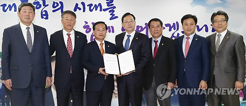 △ 경북-전남도의회 "동서화합·상생발전" (대구=연합뉴스) 경북도의회와 전남도의회가 24일 경북도의회에서 상생발전과 지방자치발전, 동서화합을 위해 함께 노력하기로 하는 공동합의문을 채택하고 기념촬영을 하고 있다. (경북도의회 제공)