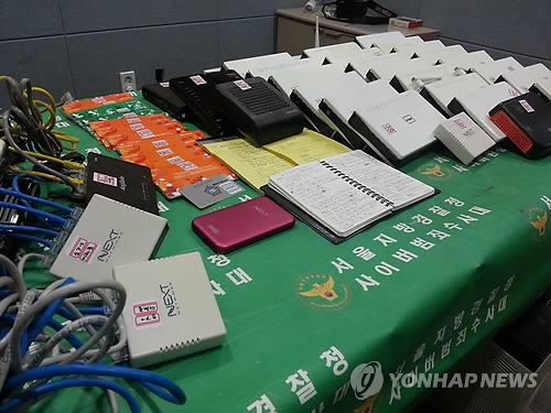 | △ 경찰에 압수된 인터넷 공유기 (서울=연합뉴스) 2만여명의 회원을 두고 판돈 9천억원대의 인터넷 도박 사이트를 운영하다 서울지방경찰청 사이버수사대에 적발된 도박업자들이 사용한 인터넷 공유기. 2015.2.24 << 서울지방경찰청 >> photo@yna.co.kr |