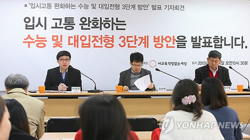 △ 사교육걱정없는세상, 대입제도 3단계 개선방안 발표 (서울=연합뉴스) 김도훈 기자 = 24일 오전 서울 용산구에 위치한 교육시민단체 사교육걱정없는세상에서 관계자들이 대입제도 3단계 개선방안 발표 기자회견을 하고 있다.