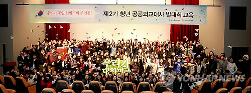△ 세계에 한국 알리는 '공공외교 대사' 발대식 (서울=연합뉴스) 강성철 기자 = 24일 서울 용산구 국립중앙박물관에서 열린 '청년 공공외교 대사' 발대식에 참가한 청소년 150여 명이 무대에서 대한민국을 바로 알리기 위한 자신들의 다짐을 적은 종이비행기를 날리며 "우리가 대한민국"이라고 힘껏 외치고 있다.