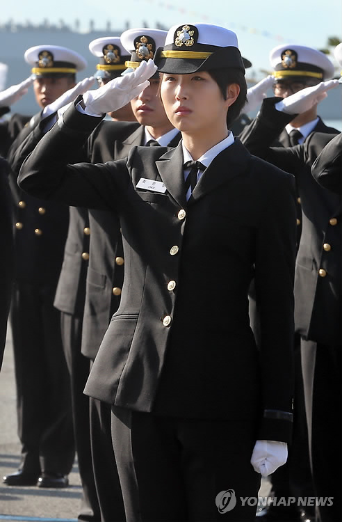 | △ 최태원 SK그룹 회장의 차녀 최민정 해군 소위가 지난해 11월 26일 경남 해군사관학교 연병장에서 열린 제117기 해군 사관후보생 임관식에서 경례를 하고 있다. (연합뉴스 자료사진) |