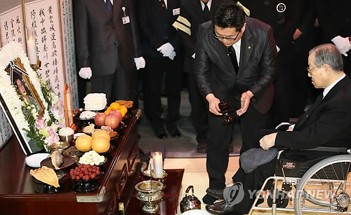 유가족이 두 번 절하는 동안 거동이 불편한 김 전 총리는 휠체어에 앉아 눌러썼던 베레모를 잠시 벗는 것으로 대신했다.
