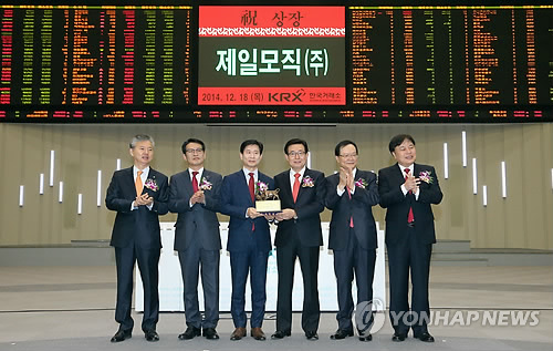 △ 지난해 12월 서울 여의도 한국거래소에서 열린 제일모직 유가증권 상장기념식에서 관계자들이 기념사진을 촬영하고 있다.