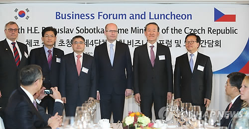 소보트카 총리는 "올해 한국은 체코 투자국 가운데 3번째 나라로 부상했다"며 "한국 기업의 투자 성공사례는 교역 규모의 급속한 확대와 체코의 수출 확대로 이어졌다는 점을 강조하고 싶다"고 덧붙였다.