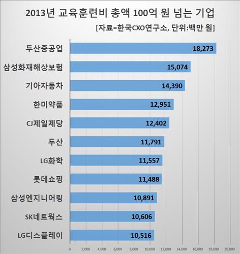 조사 대상 기업 중 가장 많은 교육비를 투자한 기업은 두산그룹 계열 두산중공업으로 2013년 182억7천여만원을 지출한 것으로 집계됐다.