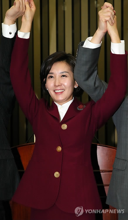 | △ 새누리, 국회 외통위원장 후보로 나경원 선출 (서울=연합뉴스) 진성철 기자 = 국회 외교통일위원장 후보로 선출된 나경원 의원(가운데)이 26일 국회에서 열린 새누리당 의원총회에서 유승민 원내대표(오른쪽), 조해진 원내수석부대표와 손을 잡고 인사하고 있다. 2015.2.26 zjin@yna.co.kr |