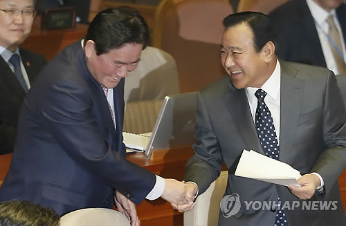 | △ 인사하는 이완구 총리와 최경환 부총리 (서울=연합뉴스) 이상학 기자 = 이완구 국무총리(오른쪽)와 최경환 경제부총리 겸 기획재정부 장관이 26일 국회 본회의에서 열린 경제 분야 대정부질문에서 인사를 하고 있다. |