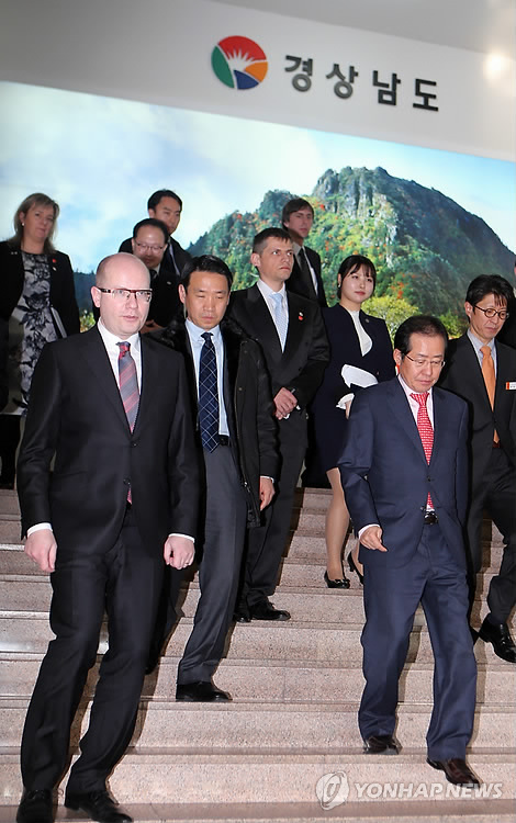 △ 경남도 찾은 체코 총리 (창원=연합뉴스) 최병길 기자 = 홍준표 경남도지사와 보후슬라프 소보트카 체코 총리가 26일 오후 경남도에서 가진 교역·투자 증진 등 경제협력 확대 방안 협의를 마치고나서 나란히 도청 계단을 내려가고 있다.