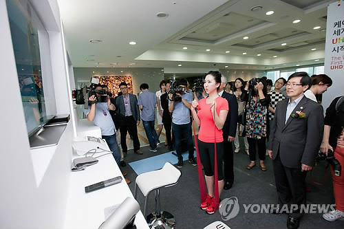| △ 케이블 UHD 상용서비스 국회시연회 (서울=연합뉴스) 윤종록 미래창조과학부 제2차관이 23일 서울 영등포구 의사당대로 국회의원회관 로비에서 열린 '케이블 UHD 상용서비스 국회시연회'에 참석, 최종삼 한국 케이블TV방송협회 부회장 등과 '스마트 헬스 케어' 시연에 대한 설명을 듣고 있다. 2014.6.23 << 미래부 제공 >> photo@yna.co.kr |