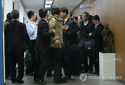 △ 충돌 (서울=연합뉴스) 김도훈 기자 = 27일 새벽 서울 광화문 원자력안전위원회에서 전체회의가 끝난 뒤 표결 결과에 항의하는 방청객과 이를 제지하는 관계자들이 충돌을 빚고 있다.