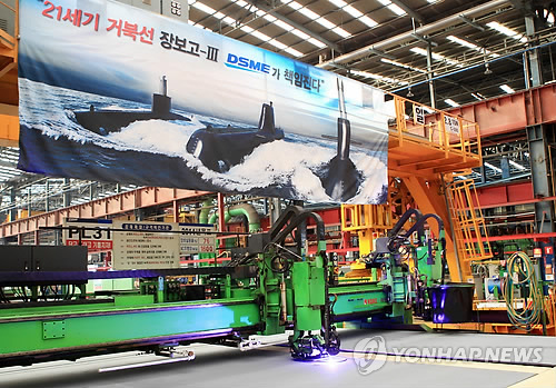 | △ 3천t급 중형 잠수함 장보고Ⅲ 건조 시작 (거제=연합뉴스) 김재홍 기자 = 27일 경남 거제시 대우조선해양 옥포조선소에서 3천t급 중형 장수함 장보고Ⅲ 건조 시작을 알리는 강재 절단 작업이 진행 중이다. 장보고Ⅲ는 2018년 진수하고 2년 전력화 과정을 거쳐 2020년 실전에 배치될 예정이다. 2014.11.27 pitbull@yna.co.kr |