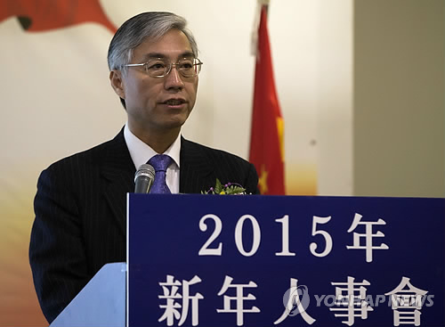 △ 축사하는 추궈훙(邱國洪) 주한 중국대사 (서울=연합뉴스) 윤동진 기자 = 추궈훙(邱國洪) 주한 중국대사가 27일 오후 서울 중구 밀레니엄 서울 힐튼호텔에서 열린 '2015년 신년인사회'에서 축사를 하고 있다. 2015.2.27 mon@yna.co.kr