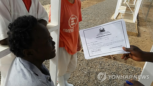 | △ 시에라리온 가더리치 에볼라 치료소(ETC)에서 한 환자가 에볼라 완치 증명서 받고 있다. (연합뉴스 자료사진) |