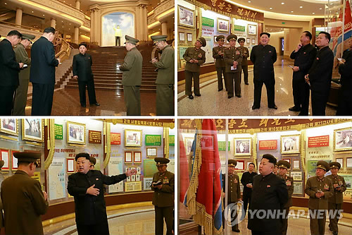 △ 김정은 전승기념관 시찰…"전체 부대를 근위부대화" (서울=연합뉴스) 북한 김정은 국방위원회 제1위원장이 평양 조국해방전쟁승리기념관(전승기념관)에 새로 조성한 근위부대관을 방문했다고 노동신문이 28일 보도했다. 노동신문은 이날 보도에서 황병서 총정치국장의 이름을 최룡해 당비서에 앞서 언급해 시선을 모았다. 사진은 김 제1위원장이 근위부대관을 시찰하는 모습.2015. 2. 28 nkphoto@yna.co.kr