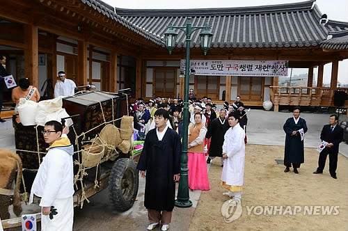 | △ 추산 선생 만주 망명행렬 재현 (안동=연합뉴스) 이덕기 기자 = 일제시대 때 독립군 양성과 항일독립전쟁 수행을 위해 설립된 서로군정서(西路軍政署)에서 어사부장 등을 역임한 추산 권기일(1886~1920) 선생이 만주 망명 길에 오르던 행렬을 재현하는 행사가 28일 경북 안동에서 열렸다. 2015.2.28. <<안동종가음식산업화사업단>> duck@yna.co.kr |