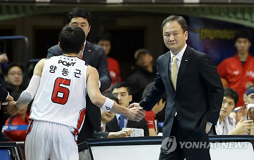 | △ '수고했어' (서울=연합뉴스) 김주성 기자 = 28일 오후 서울 잠실실내체육관에서 열린 프로농구 서울 삼성 대 울산 모비스 경기. 유재학 모비스 감독이 맹활약을 펼친 양동근을 불러들이며 손바닥을 부딪치고 있다. 2015.2.28 utzza@yna.co.kr |